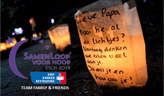 Op 31 augustus & 1 september 2019, start in Esch de SamenLoop voor Hoop: een 24-uurs wandelestafette voor iedereen die iets tegen kanker wil doen. Dit evenement wordt georganiseerd door een team van vrijwilligers uit Esch en omgeving die, verdeeld over verschillende commissies en allen op basis van hun eigen expertise en netwerk, actief hun bijdrage leveren. Het doel: sámen het leven vieren, mensen verbinden, aandacht voor gezond leven en zoveel mogelijk geld inzamelen voor KWF Kankerbestrijding. Team Family & Friends loopt ook mee met een groot team. Alle deelnemers van dit team zijn vrienden en familie van de teamcaptain. Bijzonder he? Help jij ook mee via Doelshop?