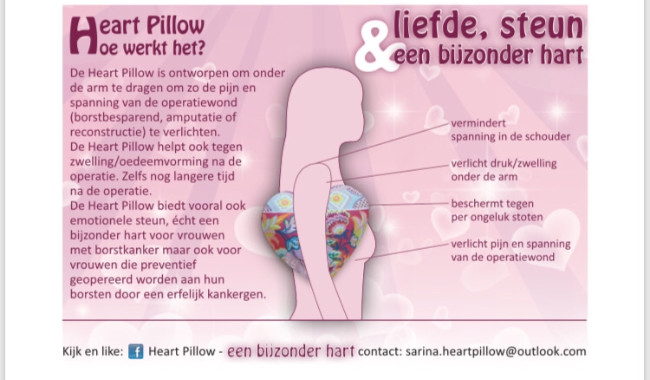 De Heart Pillow is een hartvormige kussen die onder de arm gedragen kan worden. Dit helpt tegen de pijn en spanning van de operatiewond ( borstbesparend, amputatie, reconstructie) te verlichten, ook bij zwelling en oedeemvorming na de operatie maar ook lang daarna. Het is een bijzonder hart wat ook emotionele steun geeft bij vrouwen met kanker of een erfelijk kankergen. De Heart Pillows worden vrijwillig gemaakt door vrouwen in Nederland. Zelf vertegenwoordig ik Noord-Nederland, provincie Groningen. De Heart Pillows doneer ik aan het Ommelander ziekenhuis Scheemda, het Hamelhuys inloophuis en iedereen die via de mail bestelt. Alleen via donaties kan ik dit voortzetten.